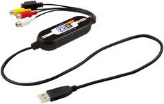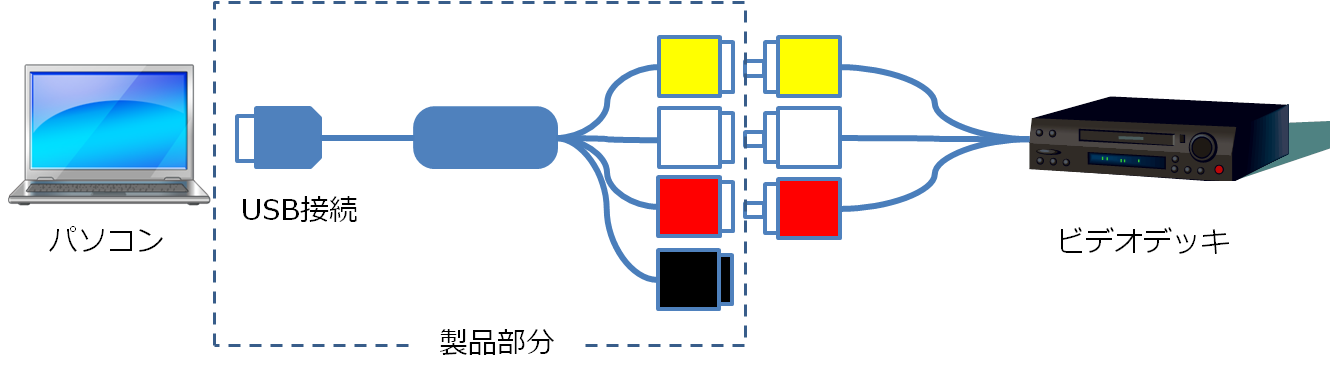 接続方法は、ビデオデッキの黄白赤のRCA出力端子と製品をつなぎ、もう片側のUSB端子をパソコンにつなげるだけ。