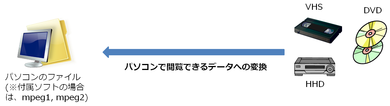 メディアに特別なプロテクションなどが無ければ、デッキで再生できるVHS、DVD、HDDなど様々なメディアを、パソコンファイルとして取り込むことができるはずです。