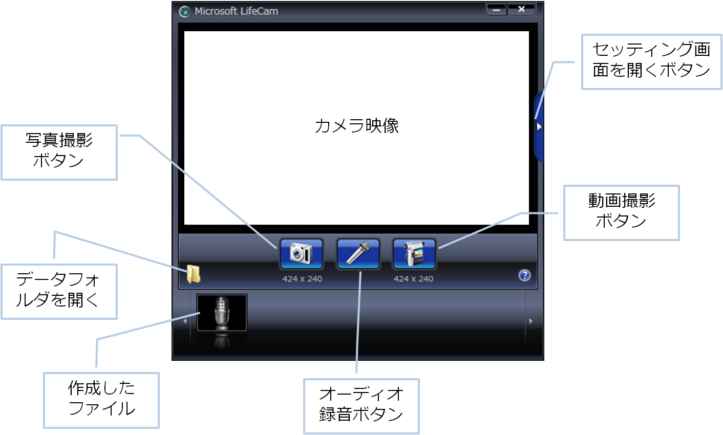 専用ソフト「Microsoft LifeCam」を開いて、ワンクリックで写真・オーディオ・ビデオのキャプチャを行います。